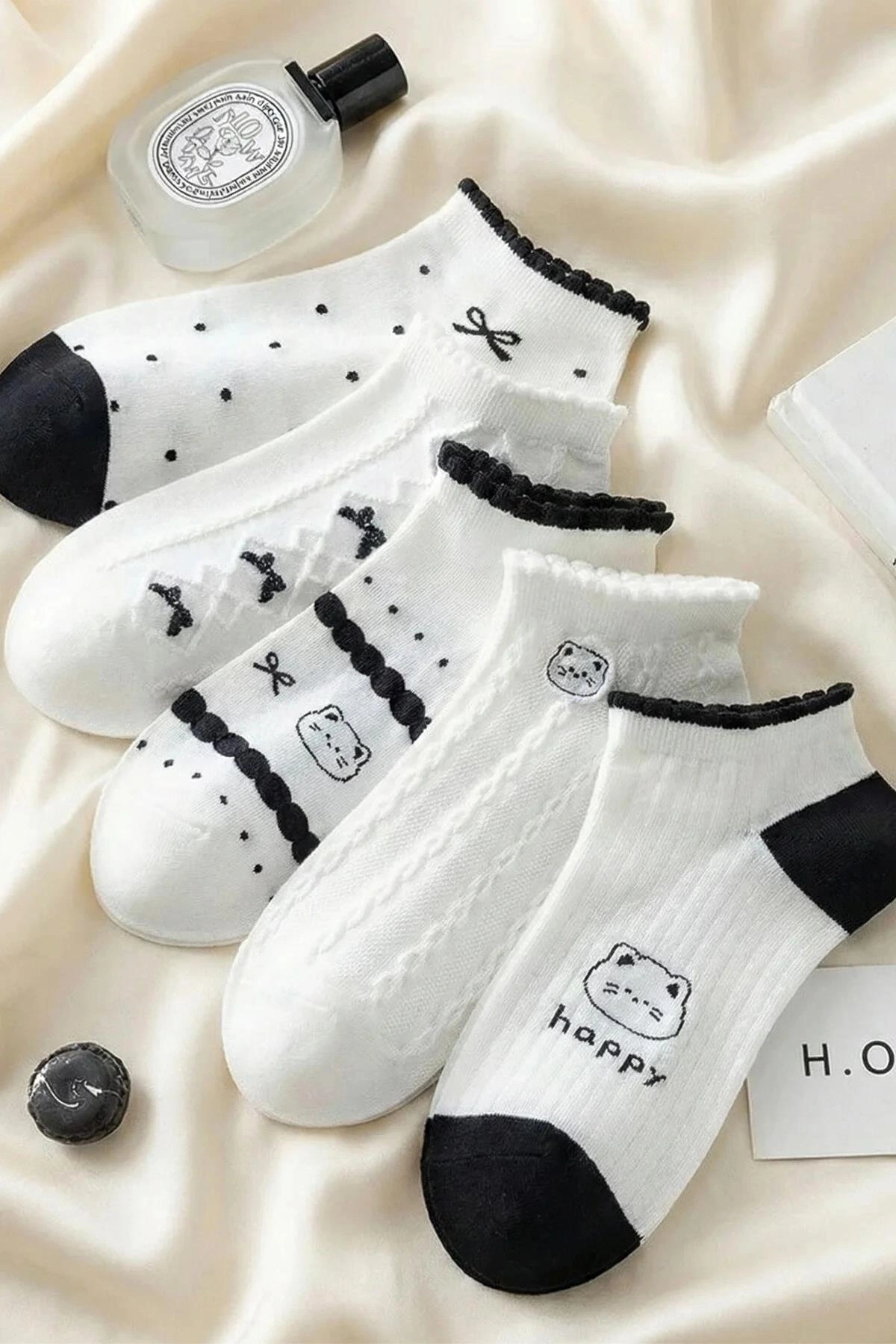 - Renkli ve neşeli desenleriyle günlük kullanımınıza renk katan 5 çift beyaz patik çorap.;
