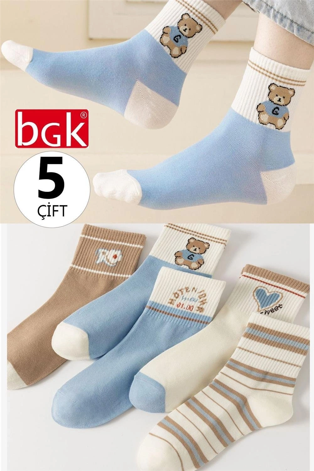 5 Çift Kadın Mavi Bej Bear Desenli Çorap
