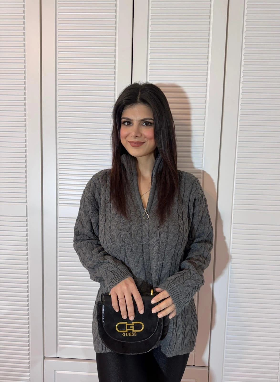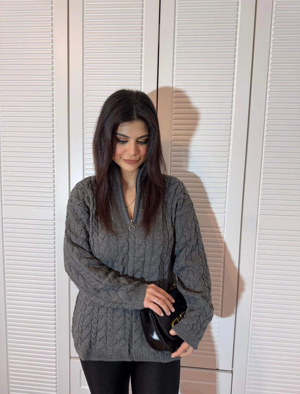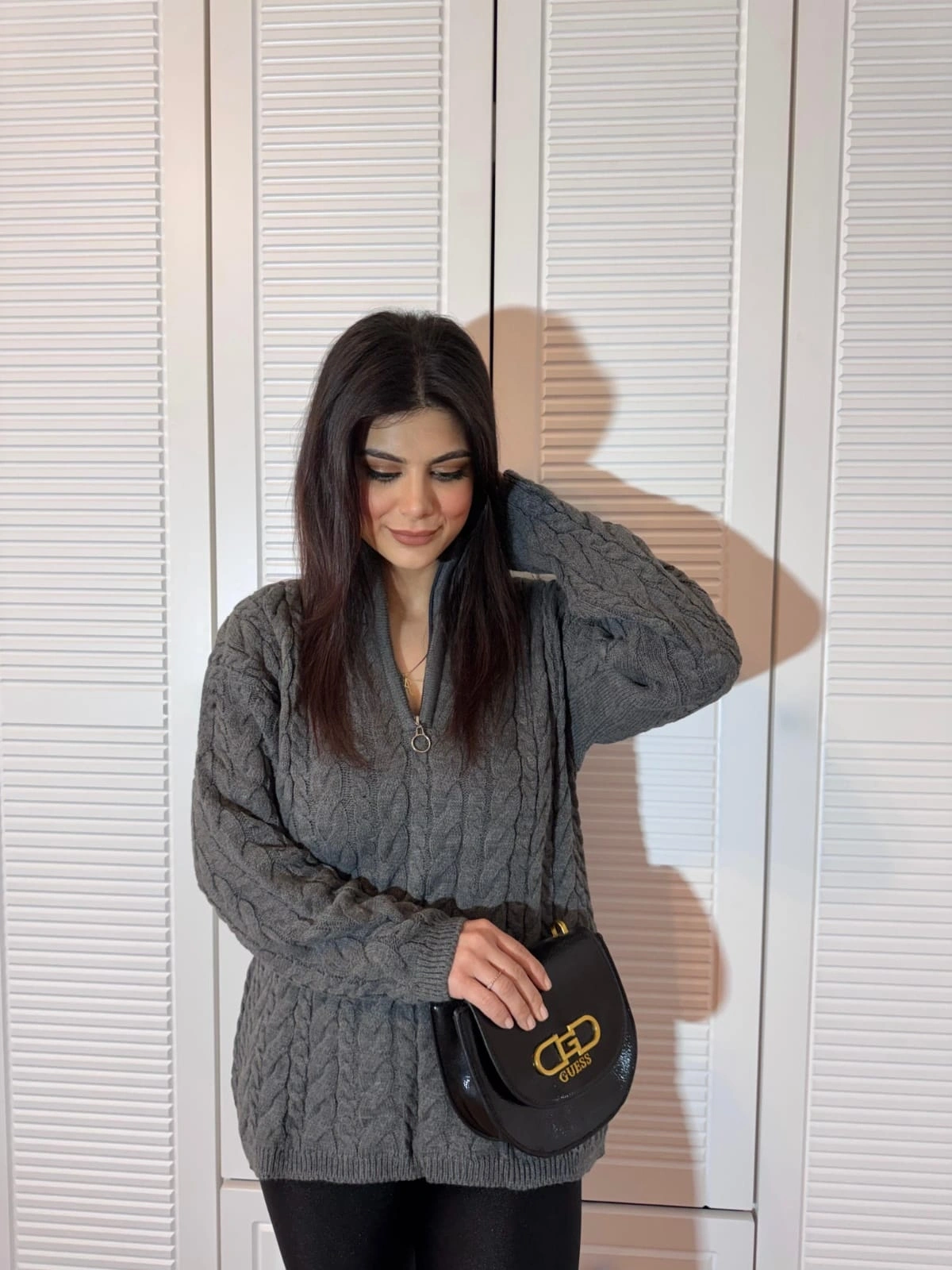 Soğuk günlerin vazgeçilmezi, hem şık hem de konforlu bir dokunuşla tanışın. Geleneksel saç örgü desenini modern fermuar detayıyla birleştiren bu oversize kazak, çabasız şıklığın anahtarı. Yumuşak dokusu sayesinde gün boyu rahatlık sunarken, fermuarlı yaka tasarımıyla stilinizi dilediğiniz gibi kişiselleştirmenize olanak tanır. İster jeanlerle günlük bir kombin yapın, ister görsellerdeki gibi mini etek ve çizmelerle iddialı bir görünüm yakalayın.