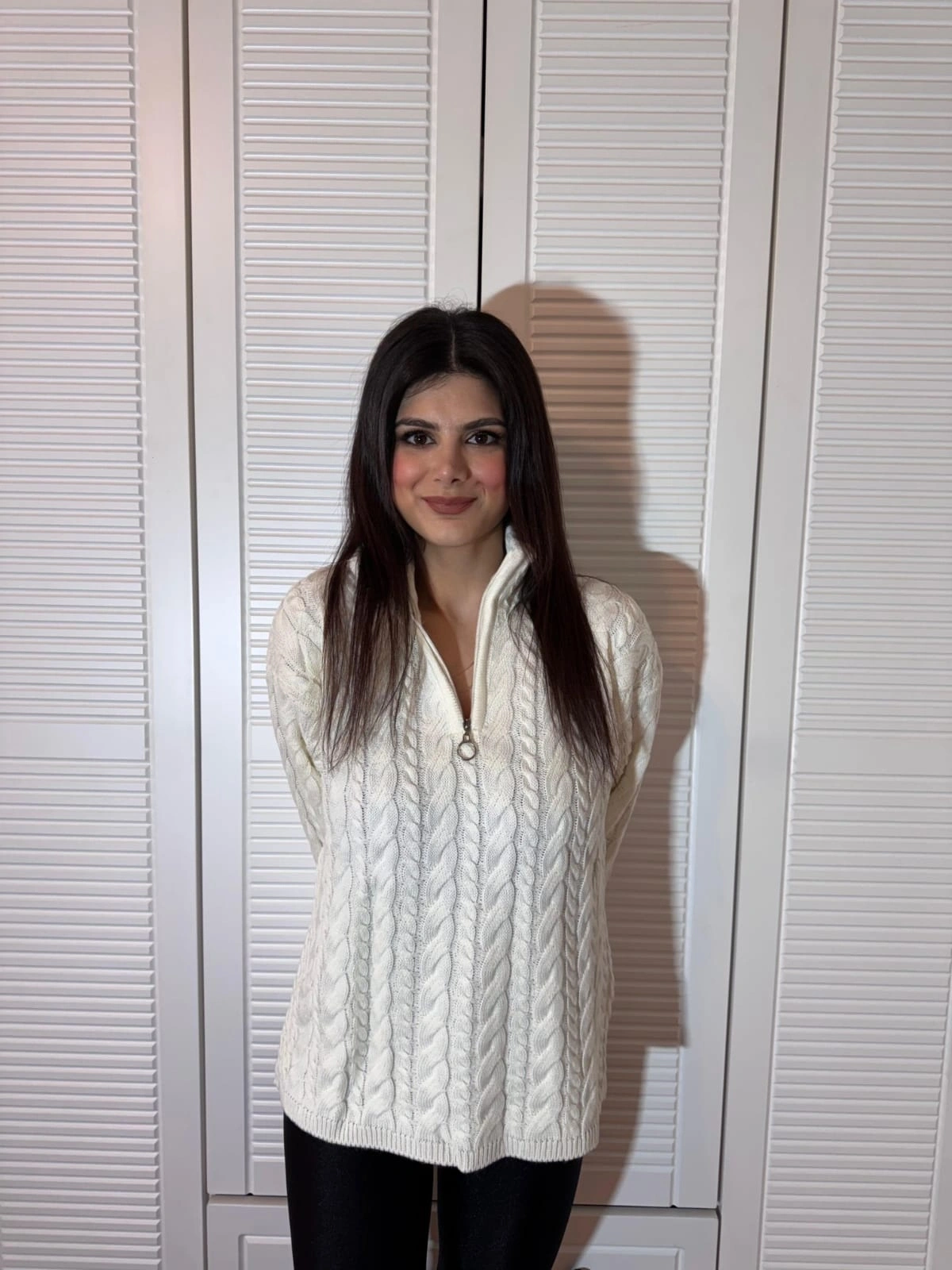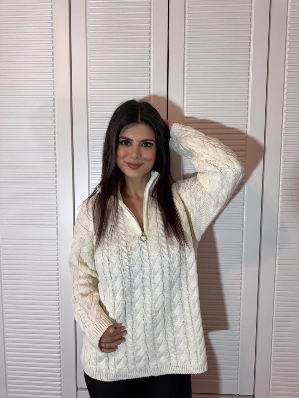Soğuk günlerin vazgeçilmezi, hem şık hem de konforlu bir dokunuşla tanışın. Geleneksel saç örgü desenini modern fermuar detayıyla birleştiren bu oversize kazak, çabasız şıklığın anahtarı. Yumuşak dokusu sayesinde gün boyu rahatlık sunarken, fermuarlı yaka tasarımıyla stilinizi dilediğiniz gibi kişiselleştirmenize olanak tanır. İster jeanlerle günlük bir kombin yapın, ister görsellerdeki gibi mini etek ve çizmelerle iddialı bir görünüm yakalayın.