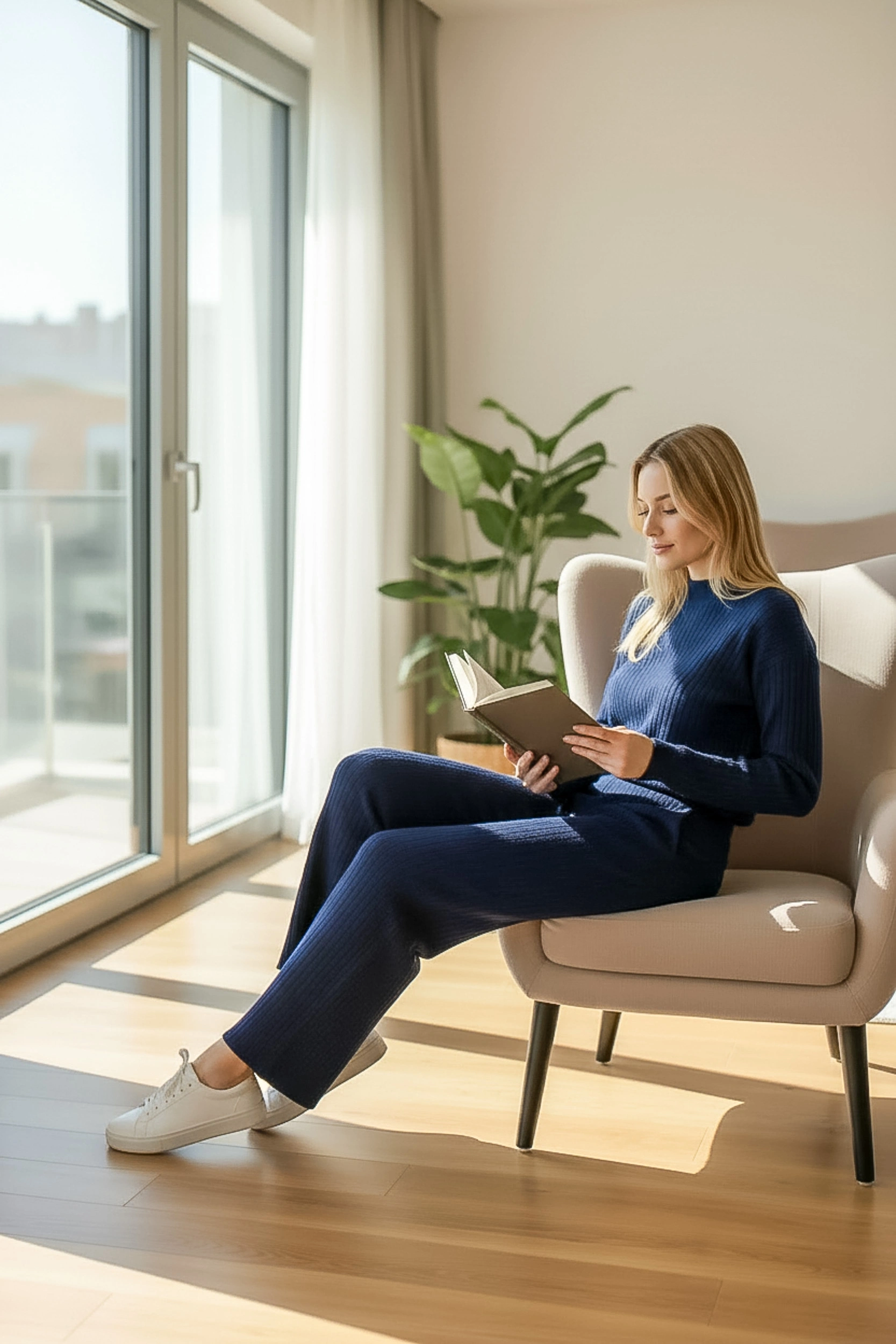 Uzun kollu crop üst modern ve zarif bir siluet oluşturur; bol paça pantolon ise hareket özgürlüğü ve şıklığı bir arada sunar.