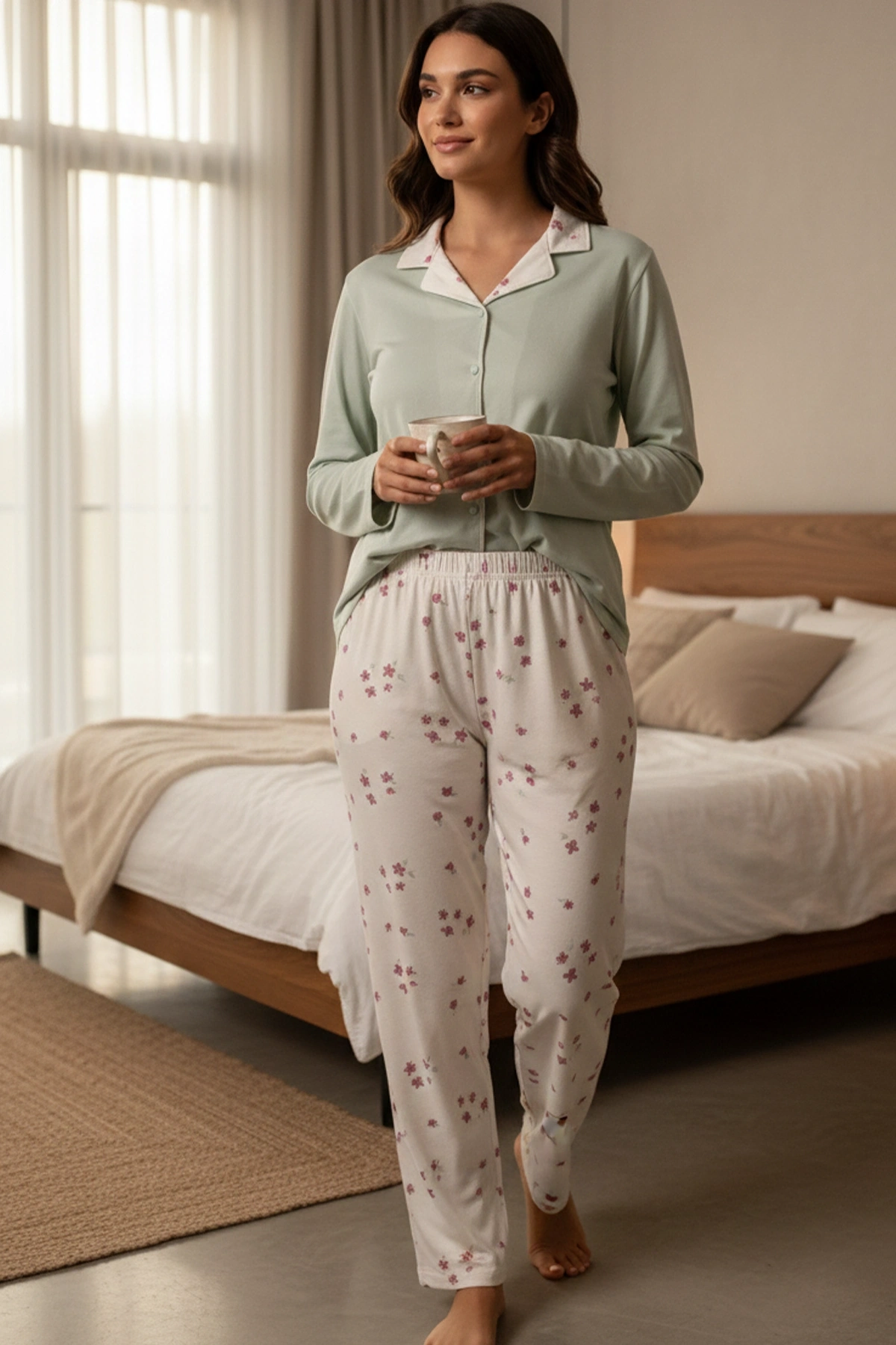 Sheenza çağla yeşili çiçek desenli kadın pijama takımı, ev giyimde rahatlık ve şıklığı bir arada sunar.