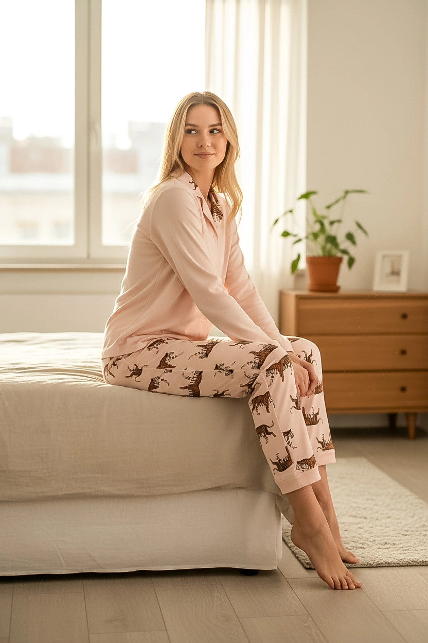 Sheenza kadın pudra kaplan desenli pijama takımı, ev giyiminde hem konforu hem de şıklığı arayan kadınlar için ideal bir seçenektir.
