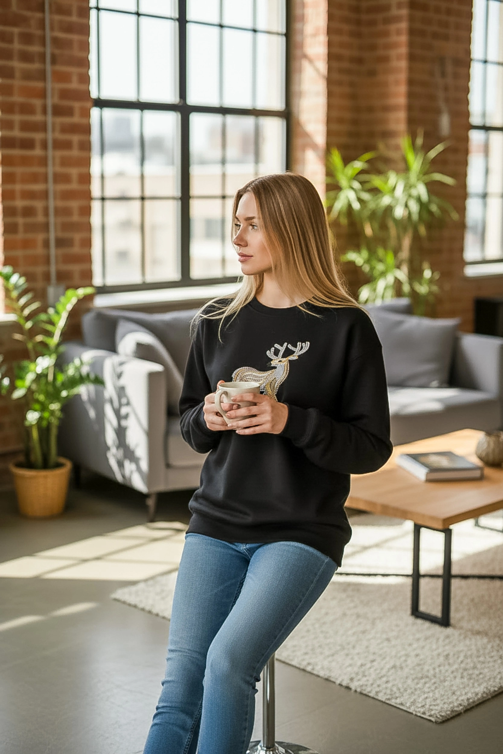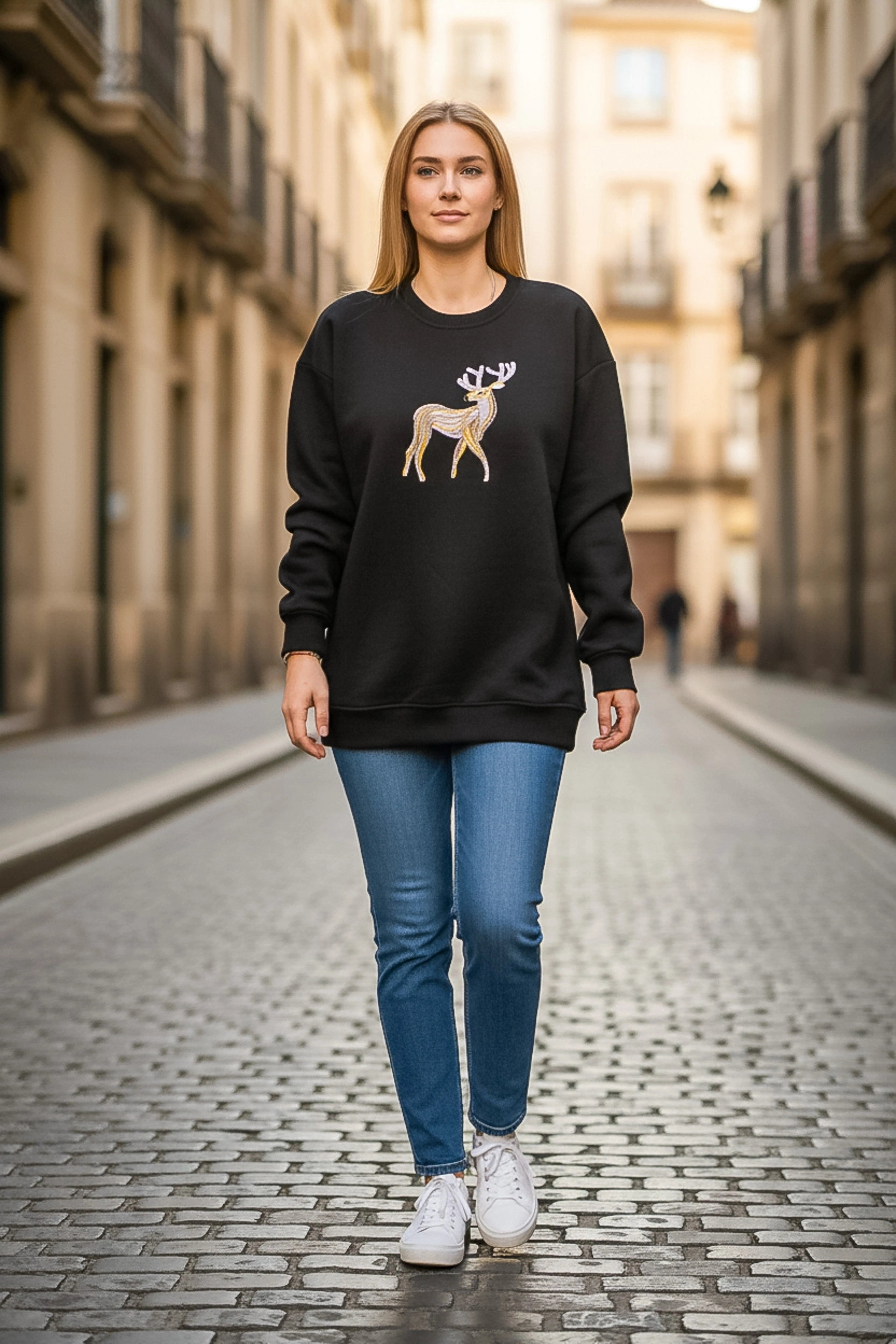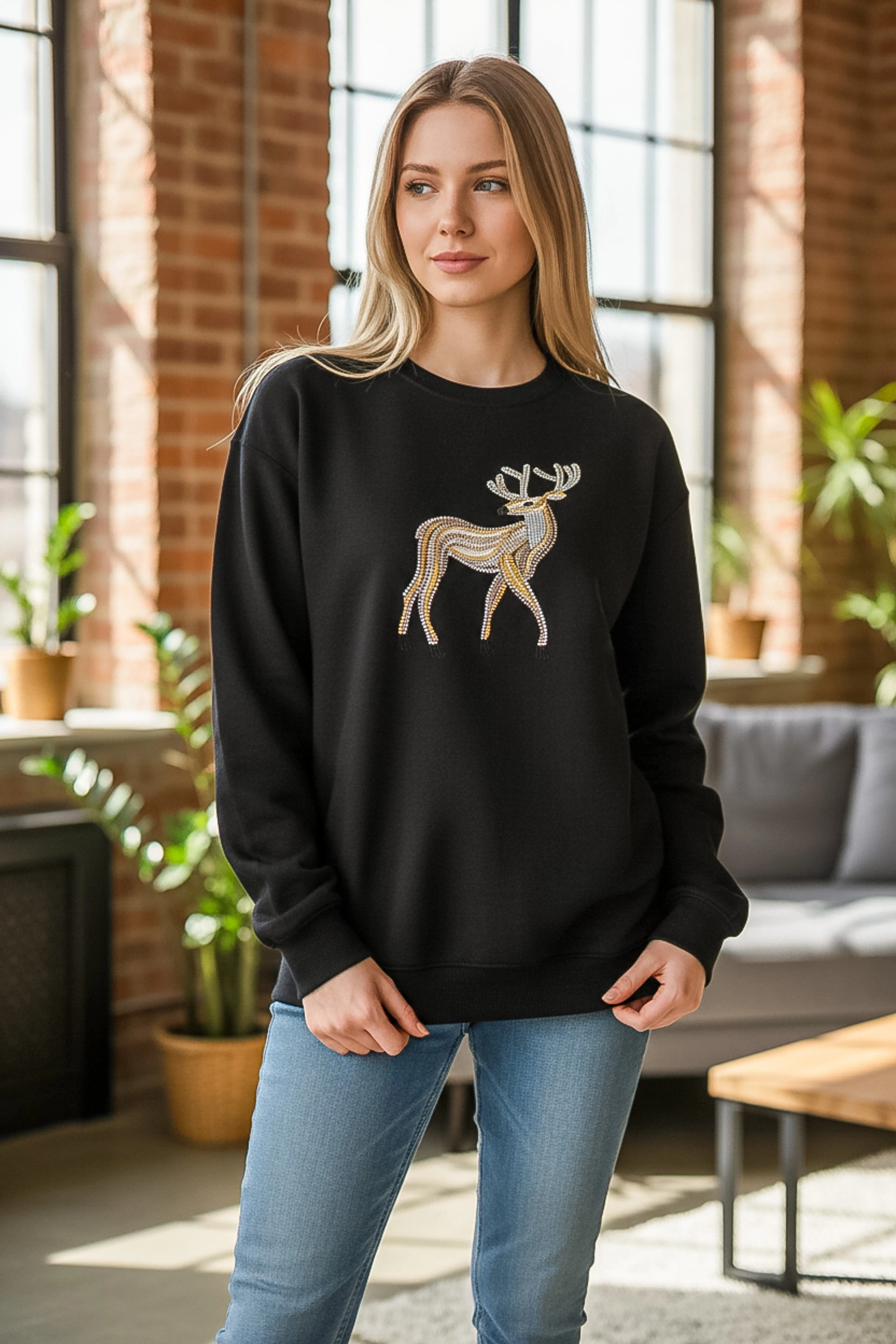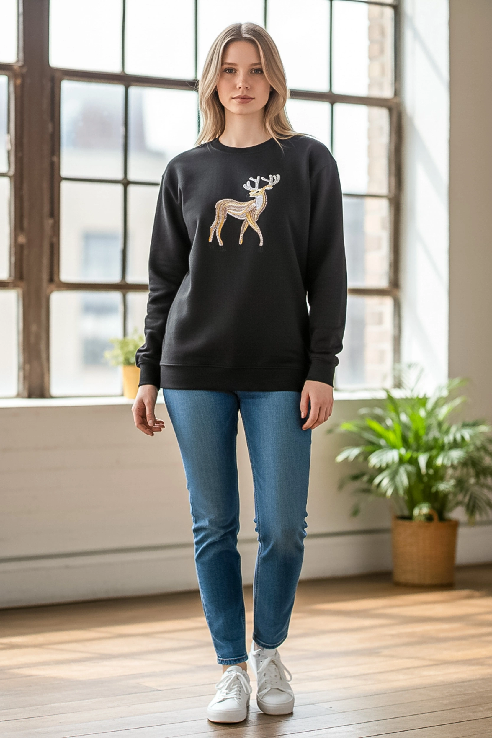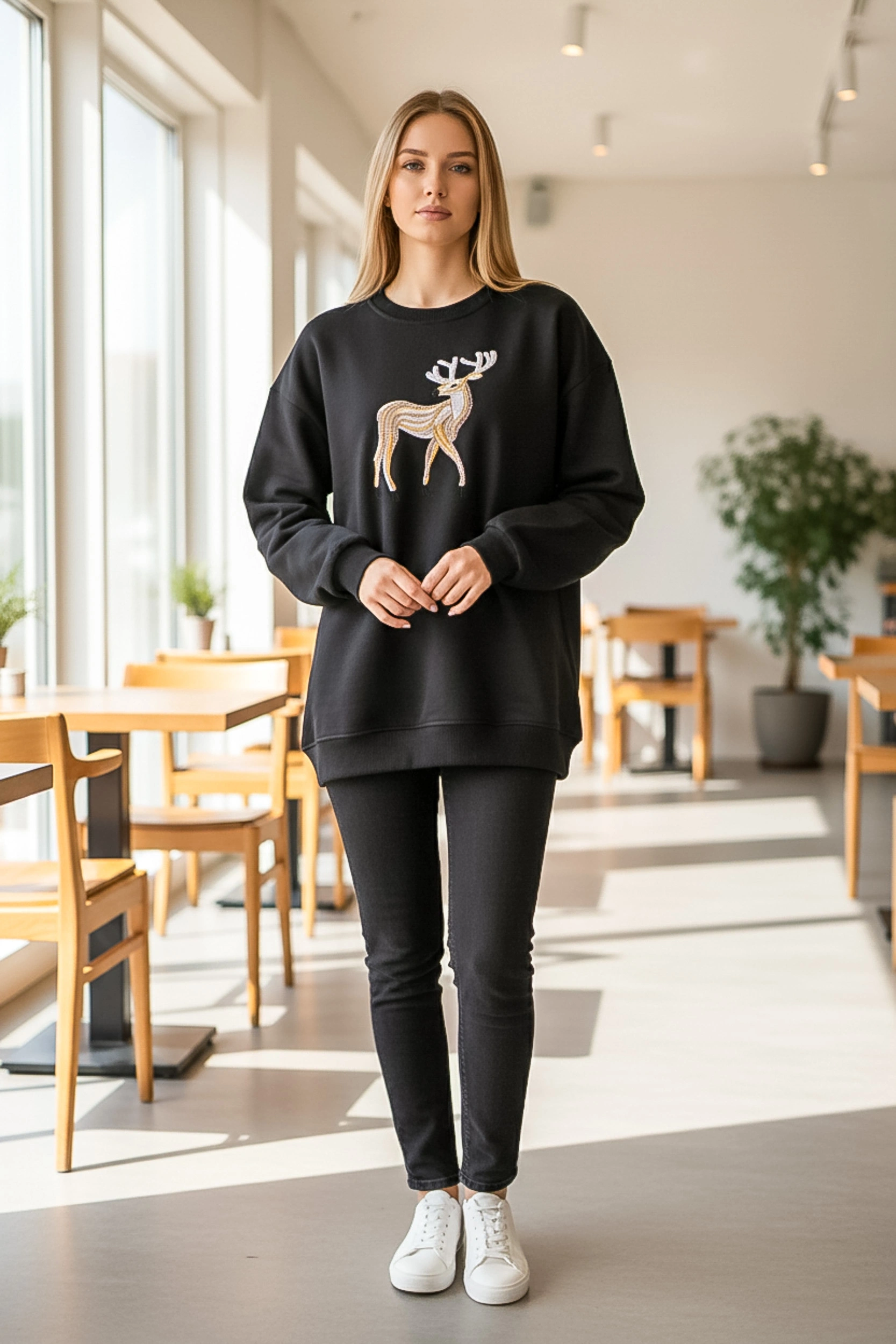 Günlük şıklığı detaylarla yükselten Sheenza siyah sweatshirt, göğüs kısmındaki geyik figürlü işlemeli/aplikeli tasarımıyla sade kombinlere güçlü bir dokunuş katar. Bisiklet yaka formu ve rahat yapısı sayesinde jean, tayt ya da eşofman altlarıyla kolayca tamamlanır. Şehir stilinde, okul/iş çıkışı kombinlerinde veya hafta sonu rahatlığında kurtarıcı bir parçadır.
