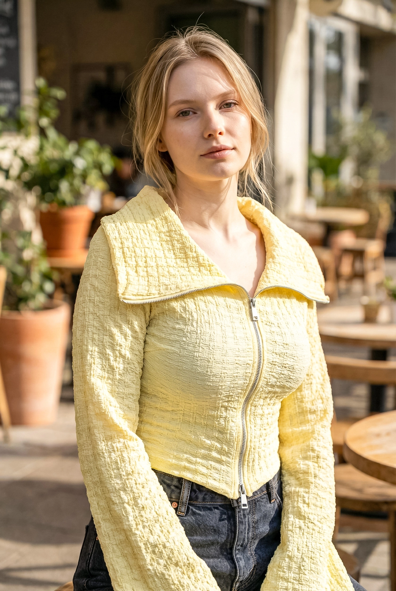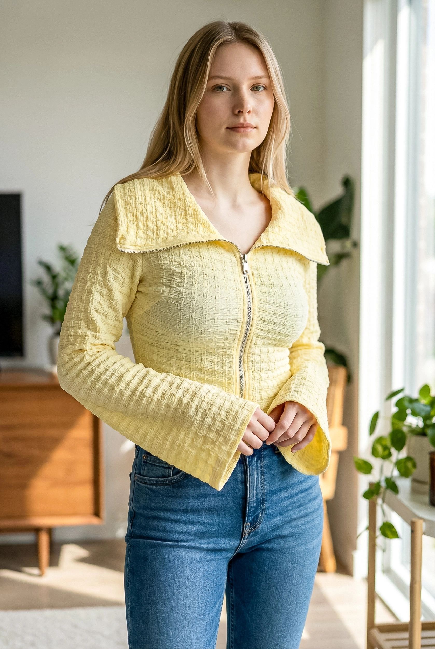 Geniş yaka detayı ve fermuarlı kapanışı ile günlük kombinlerden şık davet stillerine kadar