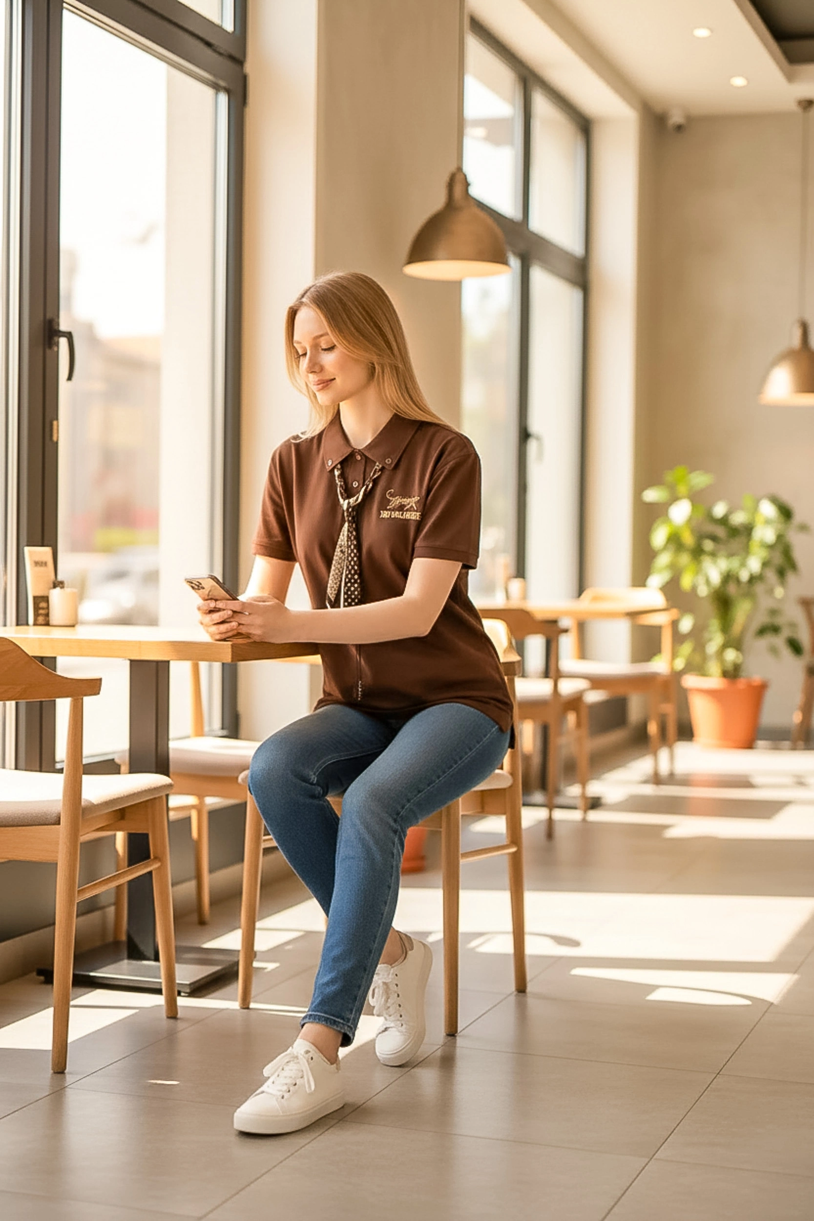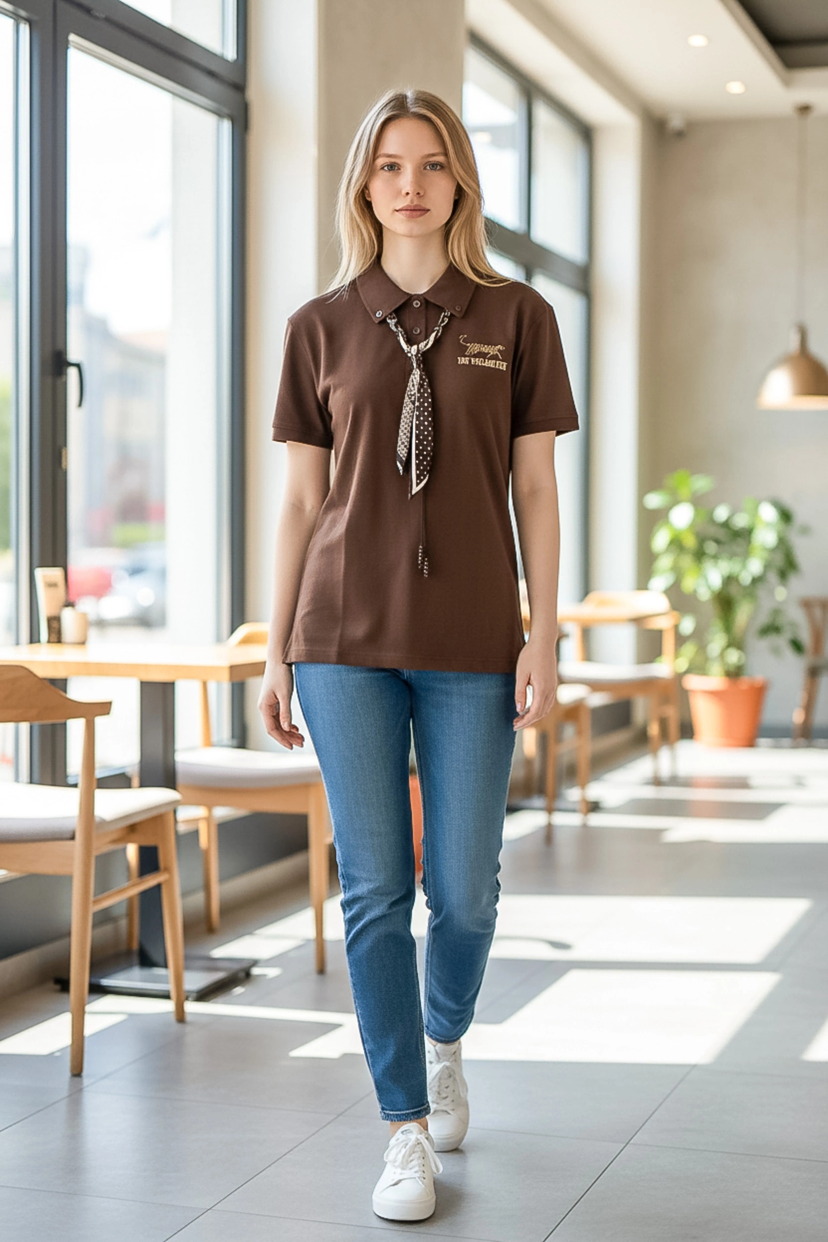 Sheenza Nakış Detaylı Kahverengi Polo Yaka Kadın Tişört, zamansız şıklığı modern dokunuşlarla buluşturur.