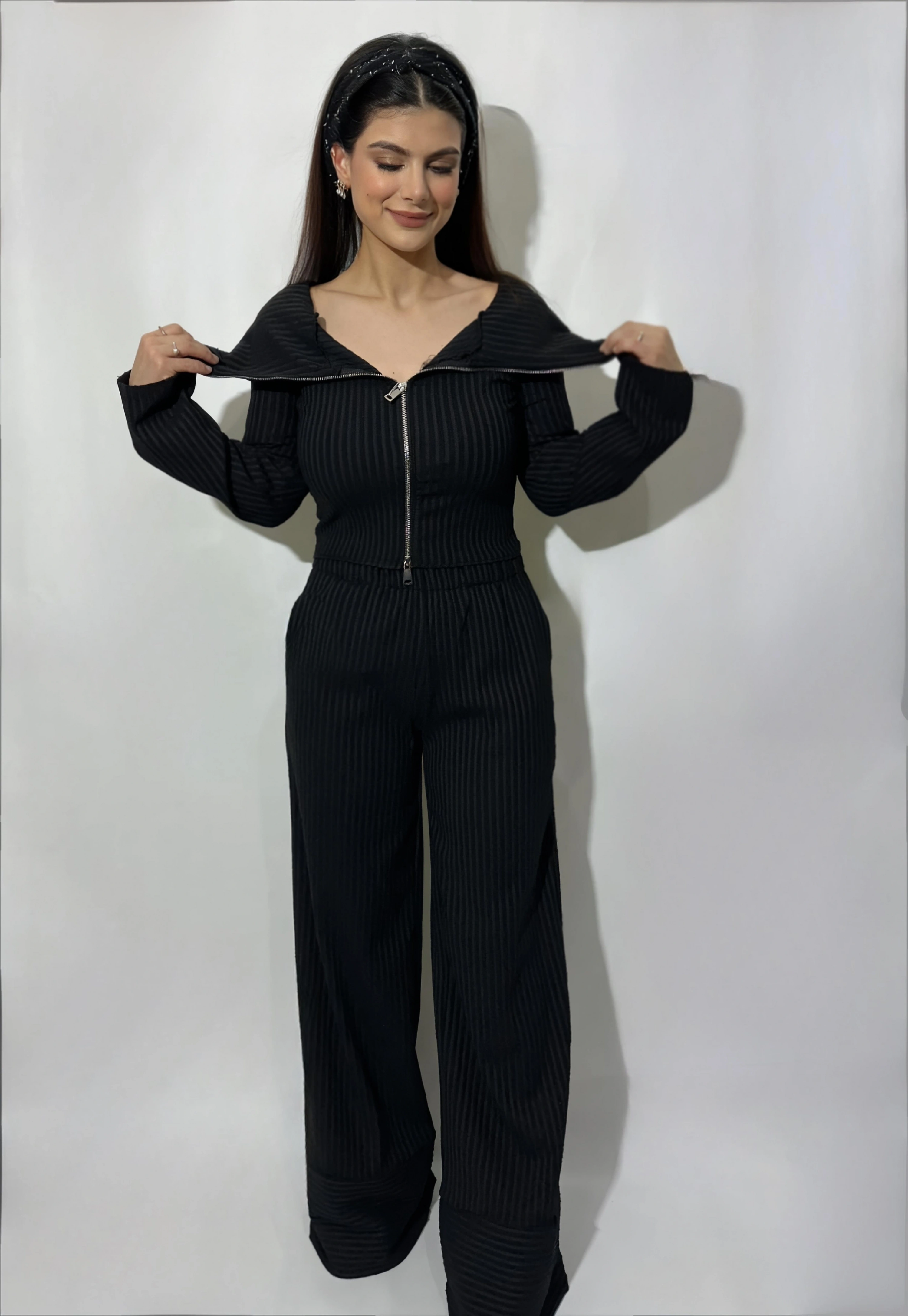 Fermuarlı Crop Triko & Bol Paça Pantolon Seti, modern kesimi ve rahat kalıbıyla şehir stiline güçlü bir duruş kazandırır.