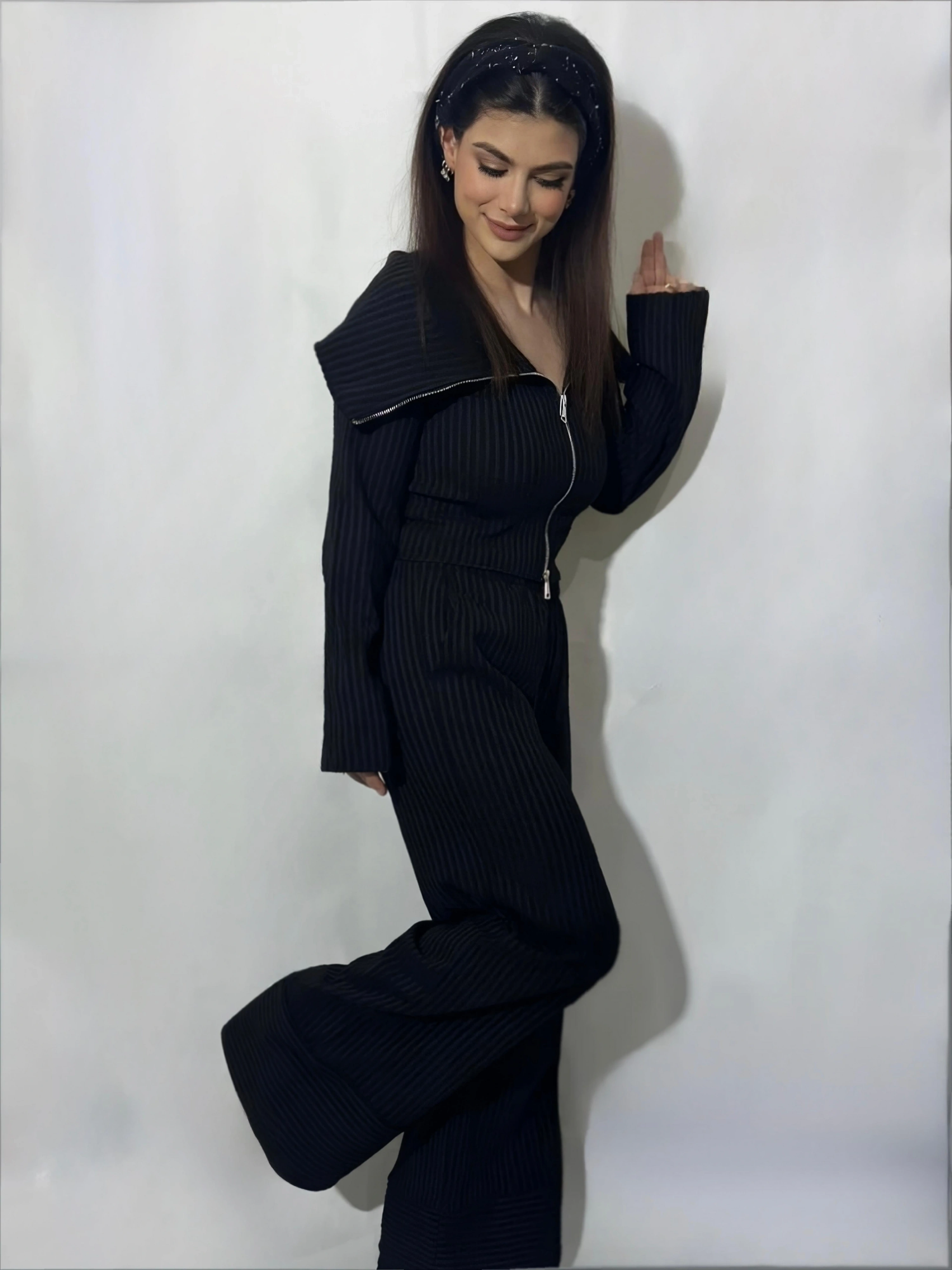 Ön fermuarlı crop üst, yüksek yakasıyla sportif ve şık bir görünüm sunarken; bol paça pantolon lastikli beli sayesinde gün boyu konfor sağlar.
