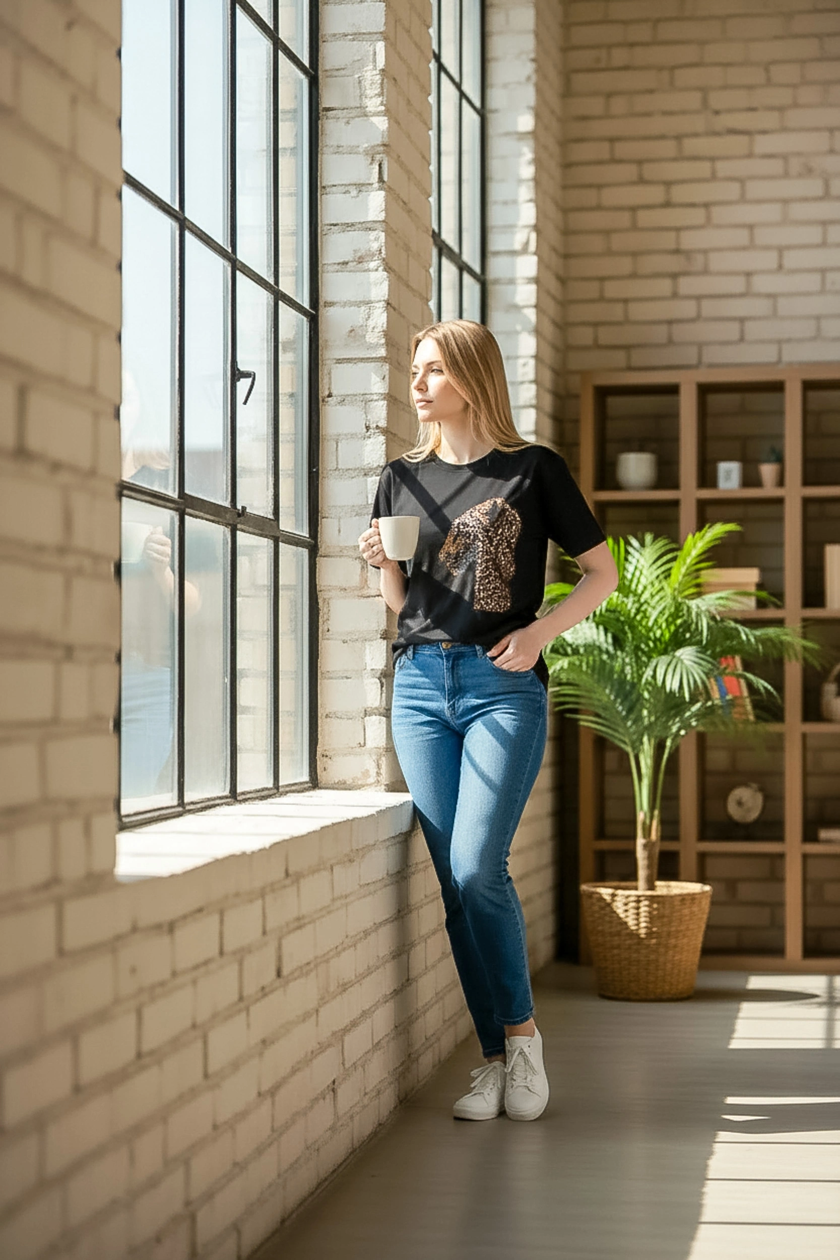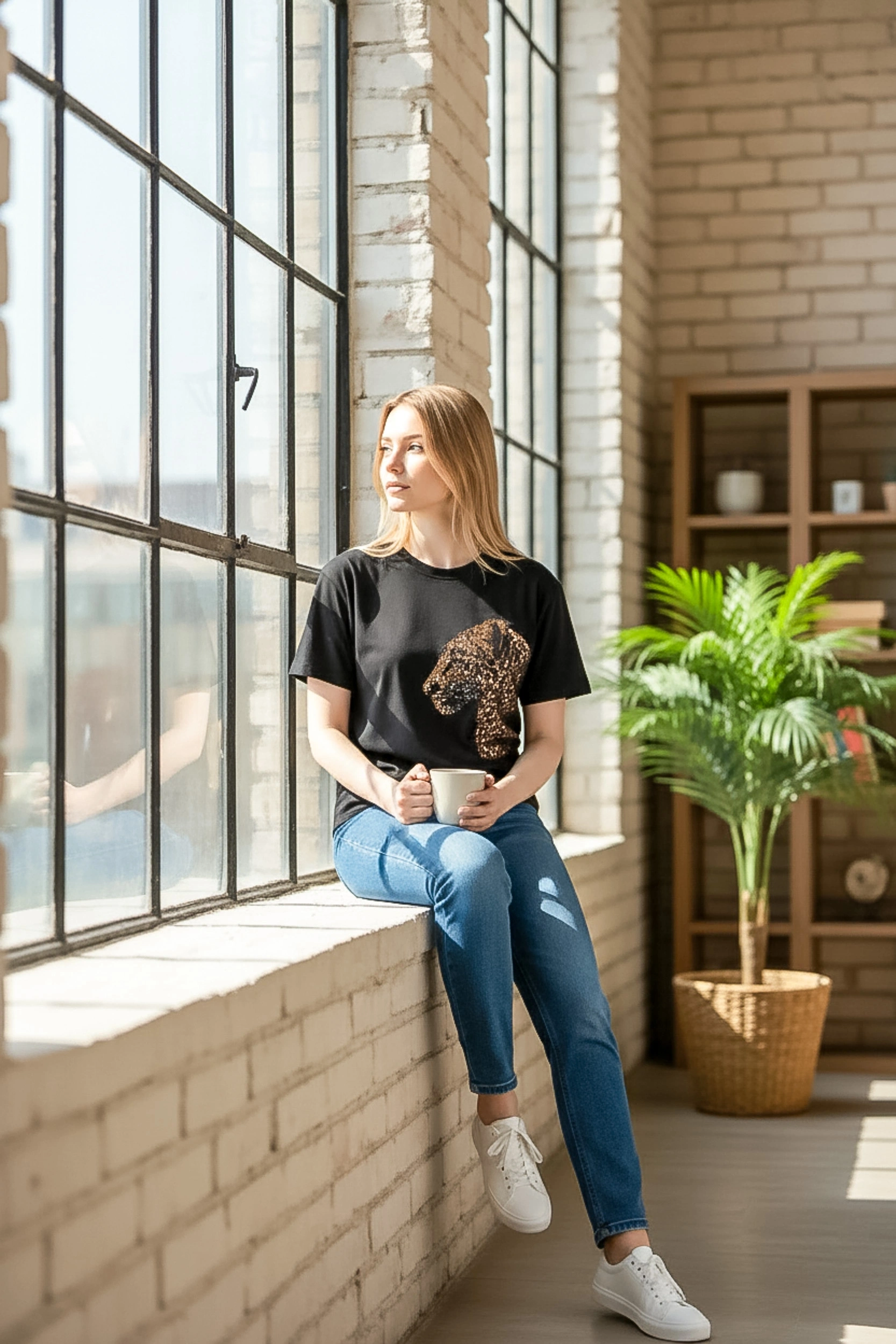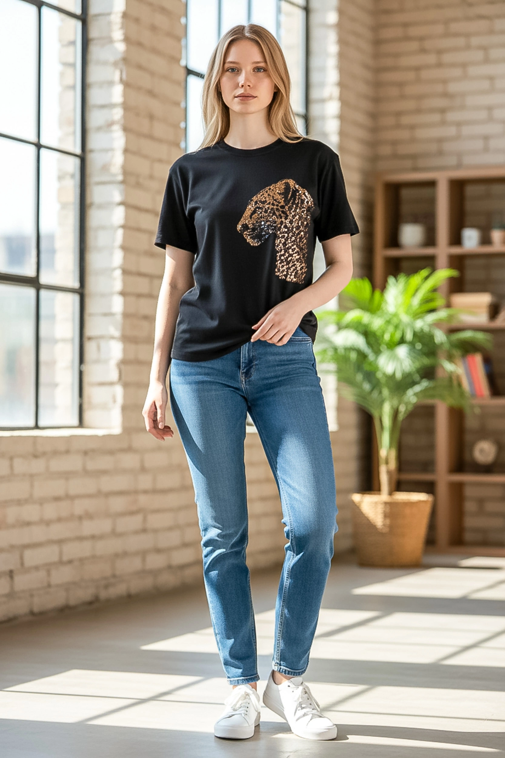Günlük stilinize lüks bir dokunuş katan payet işlemeli leopar figürü, bu siyah tişörtü sıradan bir basic olmaktan çıkarıp gece ve gündüz şıklığına taşıyor.