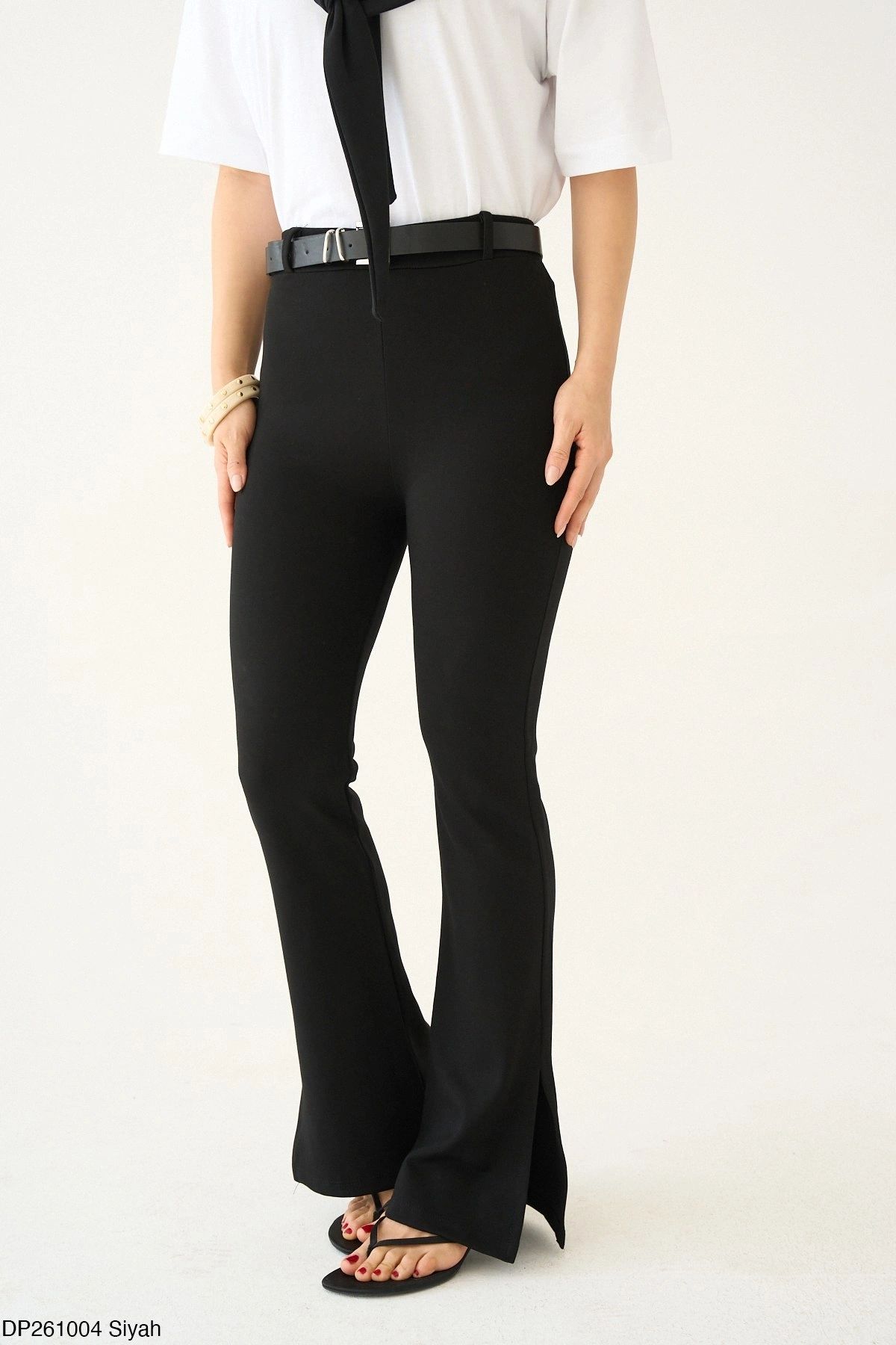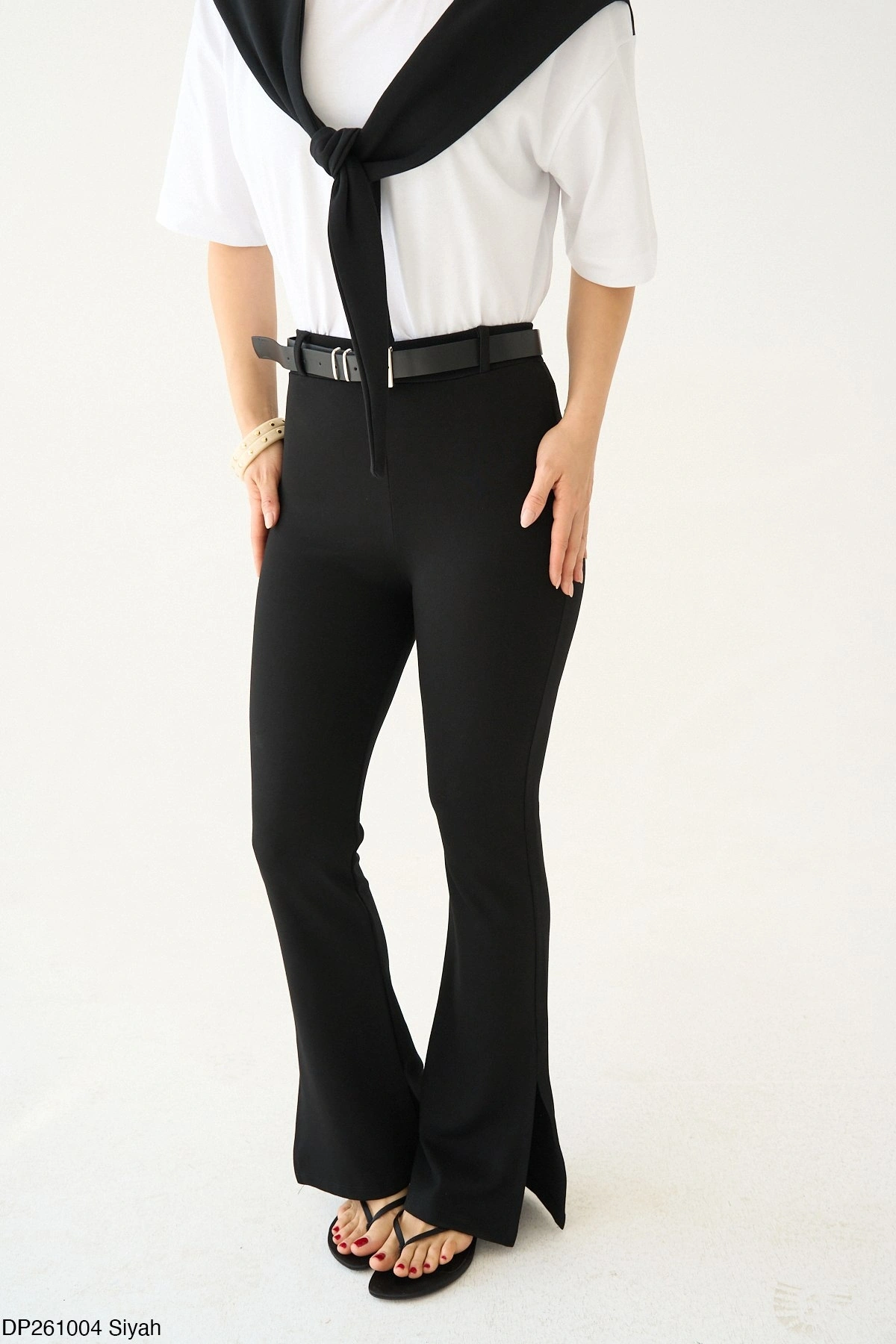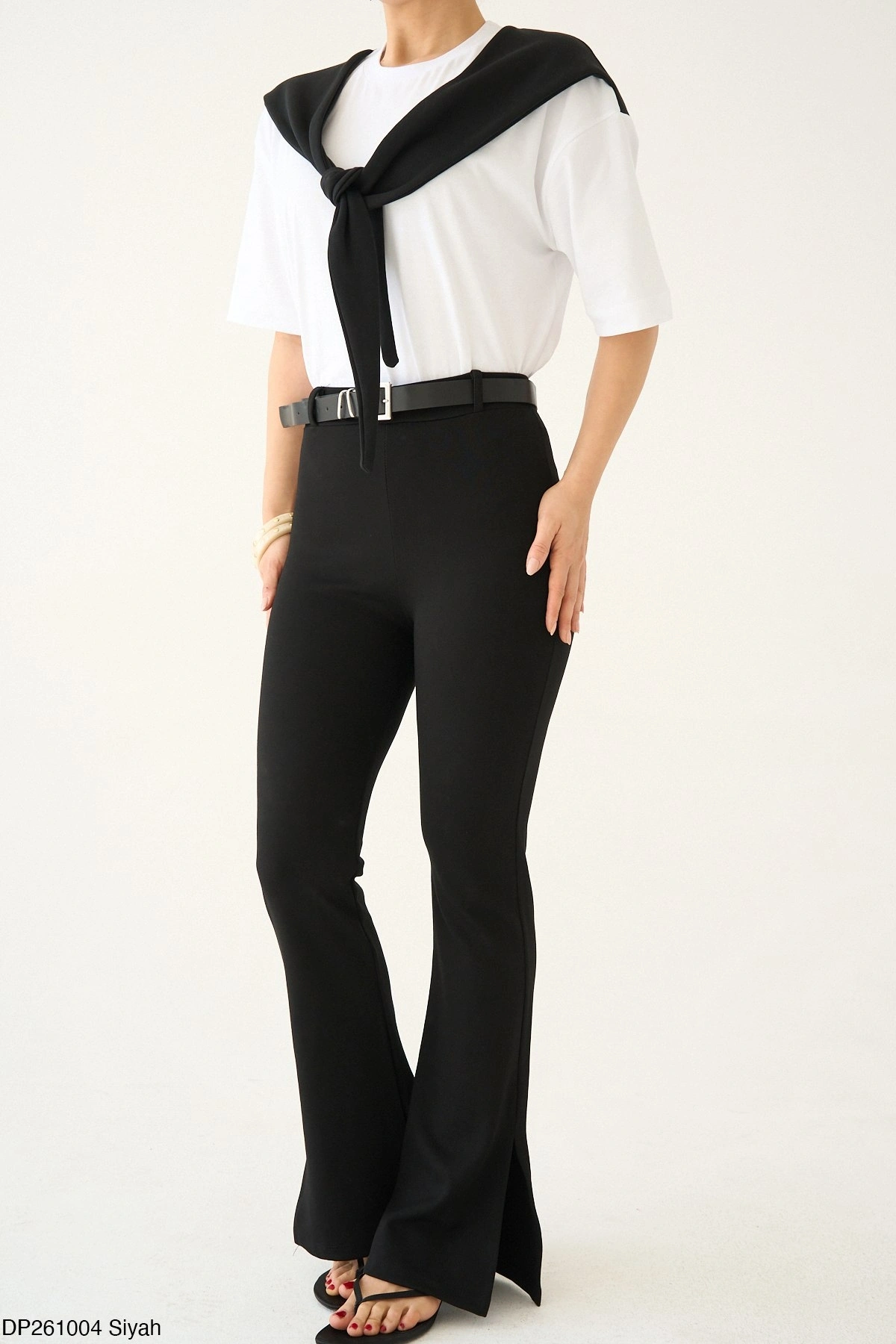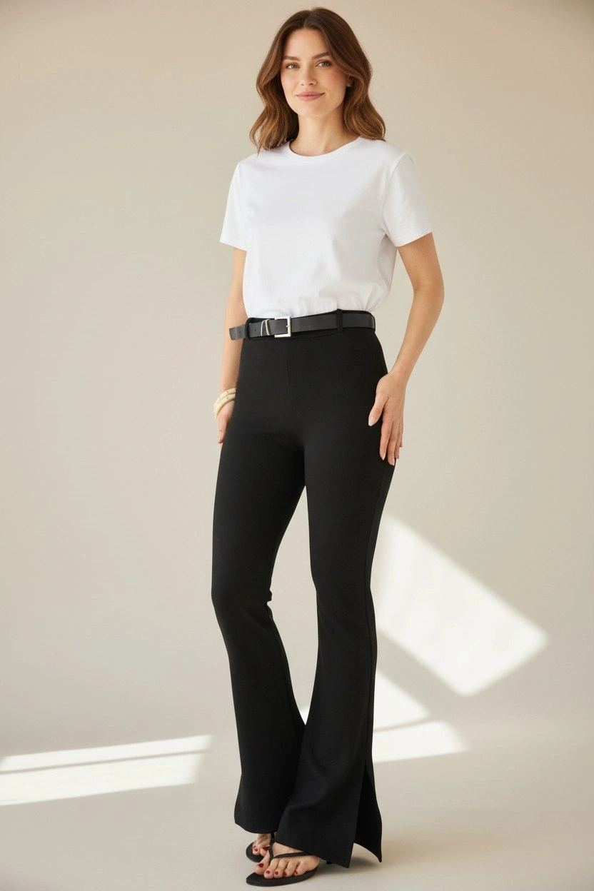 Gardırobunuzun kurtarıcı parçası olmaya aday bu siyah pantolon, vücudu saran yüksek bel kesimi ve dizden aşağı genişleyen İspanyol paça formuyla bacak boyunuzu olduğundan daha uzun gösterir.